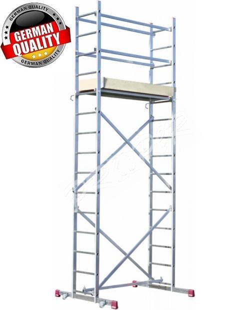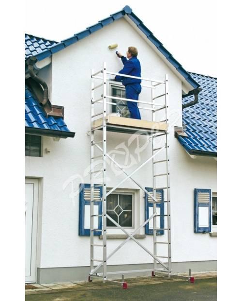 2 integrované kolieska umožňujú použitie ako pojazdné lešenie. Dve rebríkové vzpery umožňujú použitie na vonkajších stenách bez potreby dodatočnej záťaže. Lešenie je dodávané s držiakmi záťaže (závažia sa predávajú samostatne).