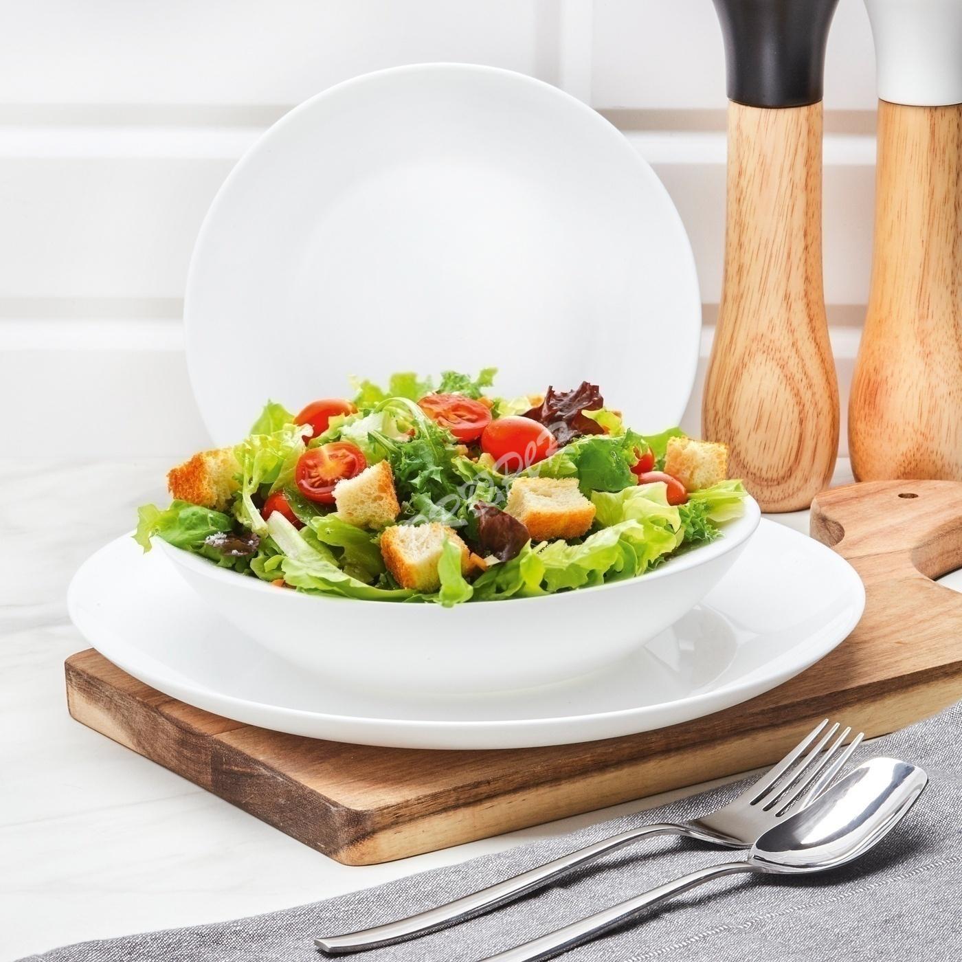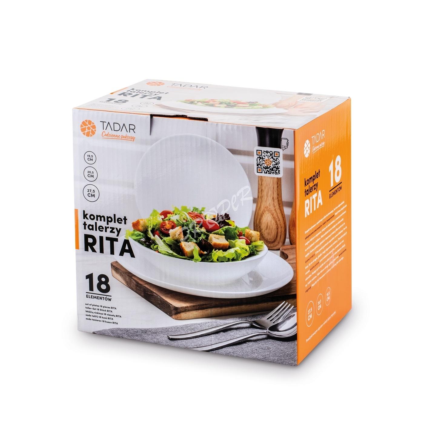 Sada Rita je praktickým a elegantným riešením pre každodenné stolovanie a rodinné stretnutia. Obsahuje 18 kusov pre 6 osôb. Obsahuje 6 plytkých tanierov (27 cm), 6 tanierov na polievku (20 cm, využiteľný objem 0,5 l) a 6 dezertných tanierov (19 cm). Vďaka tomu sa na nej ľahko servírujú hlavné jedlá aj polievky či dezerty. Taniere sú vyrobené z bieleho opálového skla, ktoré je tvrdené, a preto odolné voči mechanickému poškodeniu. Ich lesklá povrchová úprava im dodáva eleganciu a robí z nich perfektný doplnok ku každému prestieraniu – klasickému aj modernému. Sada RITA je úplne praktická – je vhodná do mikrovlnnej rúry a umývačky riadu, takže sa ľahko používa každý deň. Atraktívne kartónové balenie navyše robí zo sady perfektný svadobný alebo narodeninový darček.